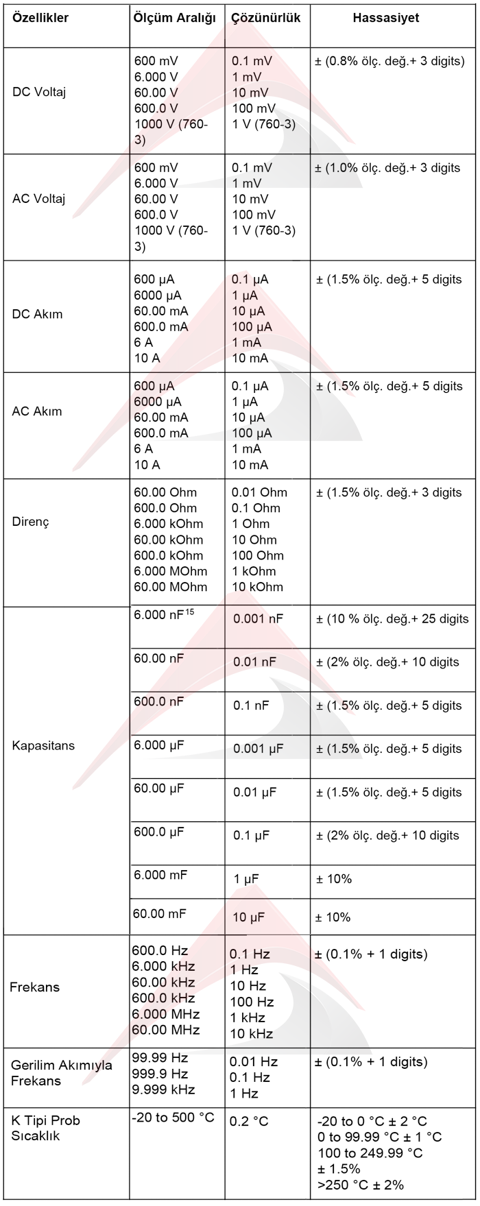 - 1000 V’a kadar gerilim aralığı, 60 MHz’ye kadar frekans aralığı ve 60 mF’ye kadar kapasitans aralığı bulunmaktadır.