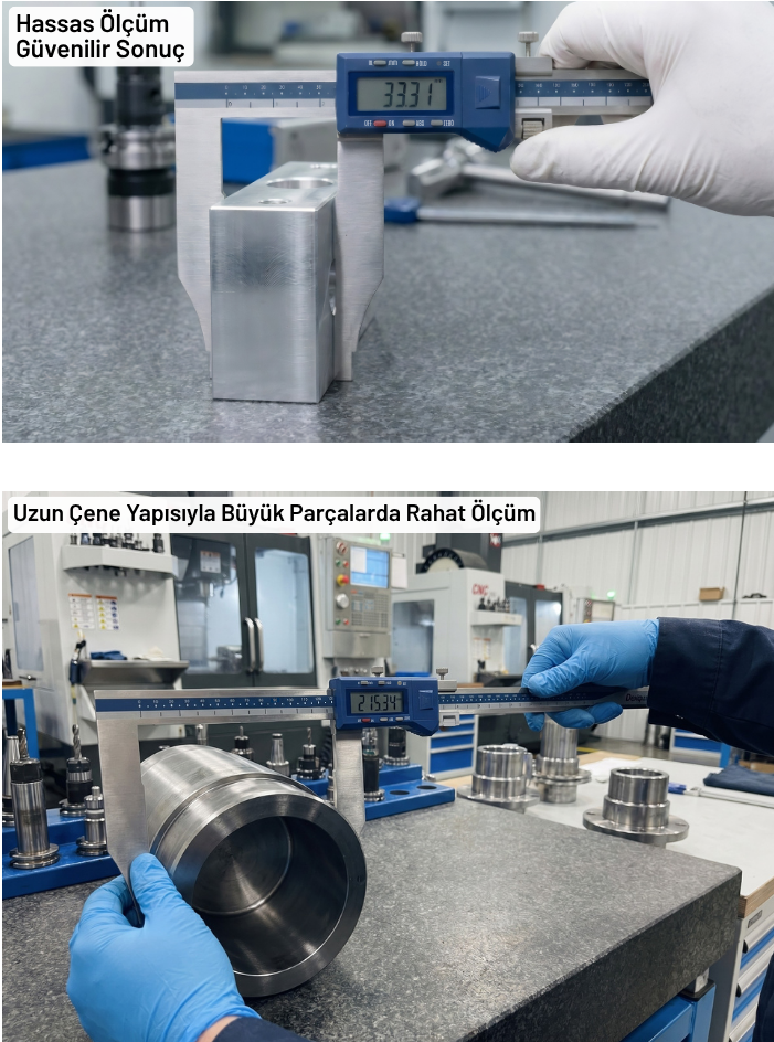 - Uzun çene tasarımı, geniş veya derin erişim gerektiren parçalarda ölçüm noktasına daha kontrollü ulaşılmasına yardımcı olur. Standart çeneli modellere göre büyük ebatlı iş parçalarında kullanım avantajı sağlar.