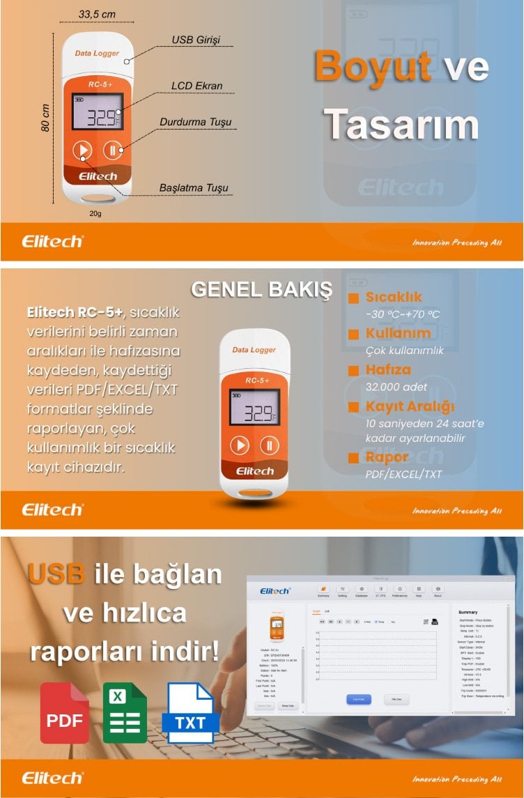 | Rapor Tipi | Otomatik PDF Raporu (Sürücüsüz) + ElitechLog Yazılımı ile (PDF/Excel/Word/TXT) |