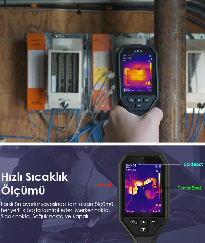 B21LS, günlük endüstriyel kullanım için yüksek performanslı, elde taşınabilir bir termal kamera çözümüdür. Yüksek çözünürlüklü ekranı ve SuperIR görüntü iyileştirme teknolojisi sayesinde, görünmeyen ısı farklılıklarını hızlı ve net şekilde tespit eder. Geniş sıcaklık aralığı, güçlü ölçüm doğruluğu ve dahili Wi-Fi ile sahada hızlı analiz ve paylaşım imkanı sunar. Elektrik, bina, HVAC, bakım ve arıza tespit uygulamaları için idealdir.