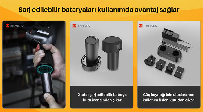 - HIKMICRO M20 serisinin içerisinden çıkan 2 adet değiştirilebilir Li-Ion pil sayesinde kamera yaklaşık 12 saat boyunca kullanılabilmektedir. Bir pil 6 saat boyunca görüntüleme sağlar, iki pil ile toplam 12 saat çalışılabilir.