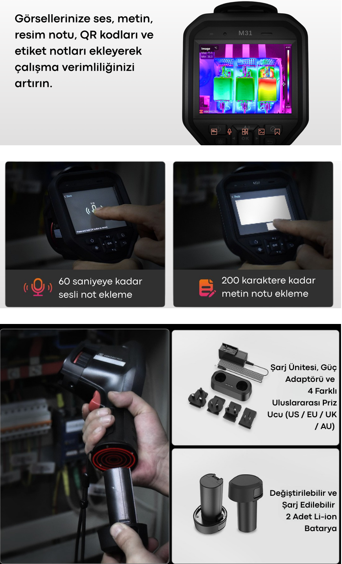 - M31 termal kamera, ±2°C veya ±%2 ölçüm doğruluğu ile profesyonel kullanıcıların bakım ve kontrol çalışmalarında güvenilir sıcaklık verileri elde etmesine yardımcı olur.