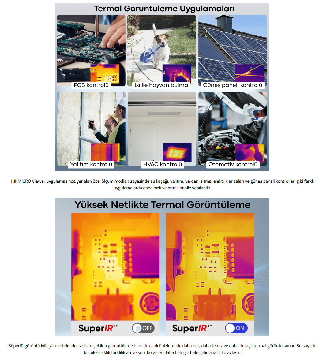 - iOS ve Android için HIKMICRO Viewer uygulaması ile sahada hızlı analiz, görüntü alma, video kaydı, not ekleme ve paylaşım yapılabilir. Windows tarafında HIKMICRO Analyzer yazılımı ile daha detaylı inceleme, arşivleme ve raporlama süreçleri desteklenir.