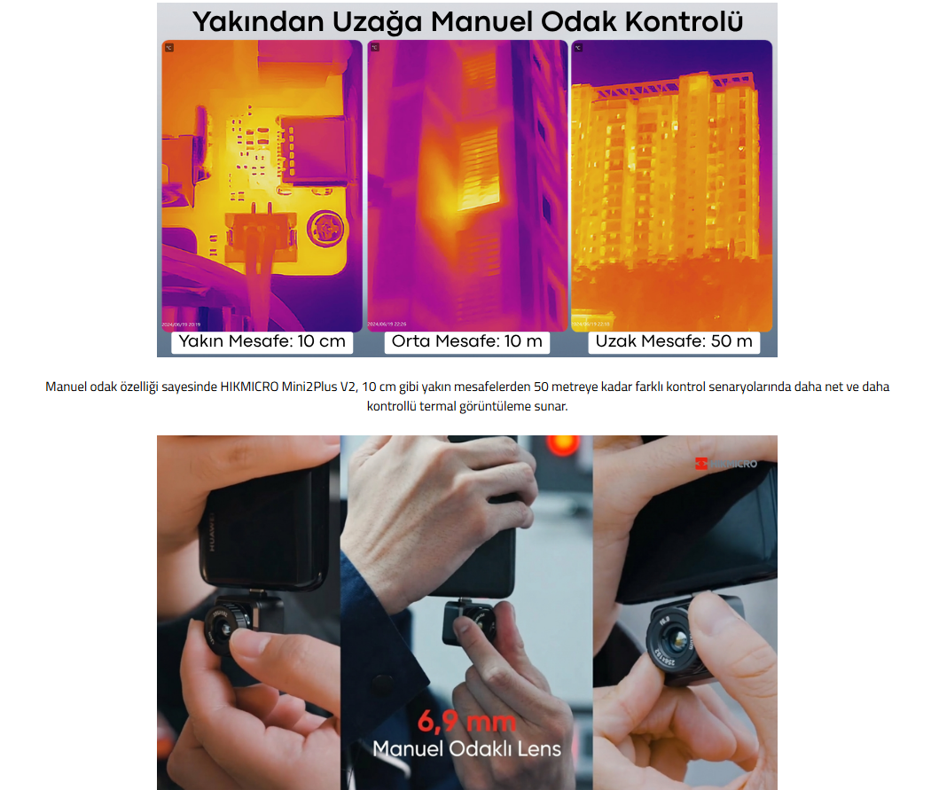 - Manuel odak lens yapısı sayesinde Mini2Plus V2, 10 cm minimum odak mesafesinden 50 metreye kadar farklı mesafelerde daha net görüntüleme sağlar. Yakın elektronik incelemelerden güvenli mesafedeki ekipman kontrollerine kadar geniş kullanım esnekliği sunar.