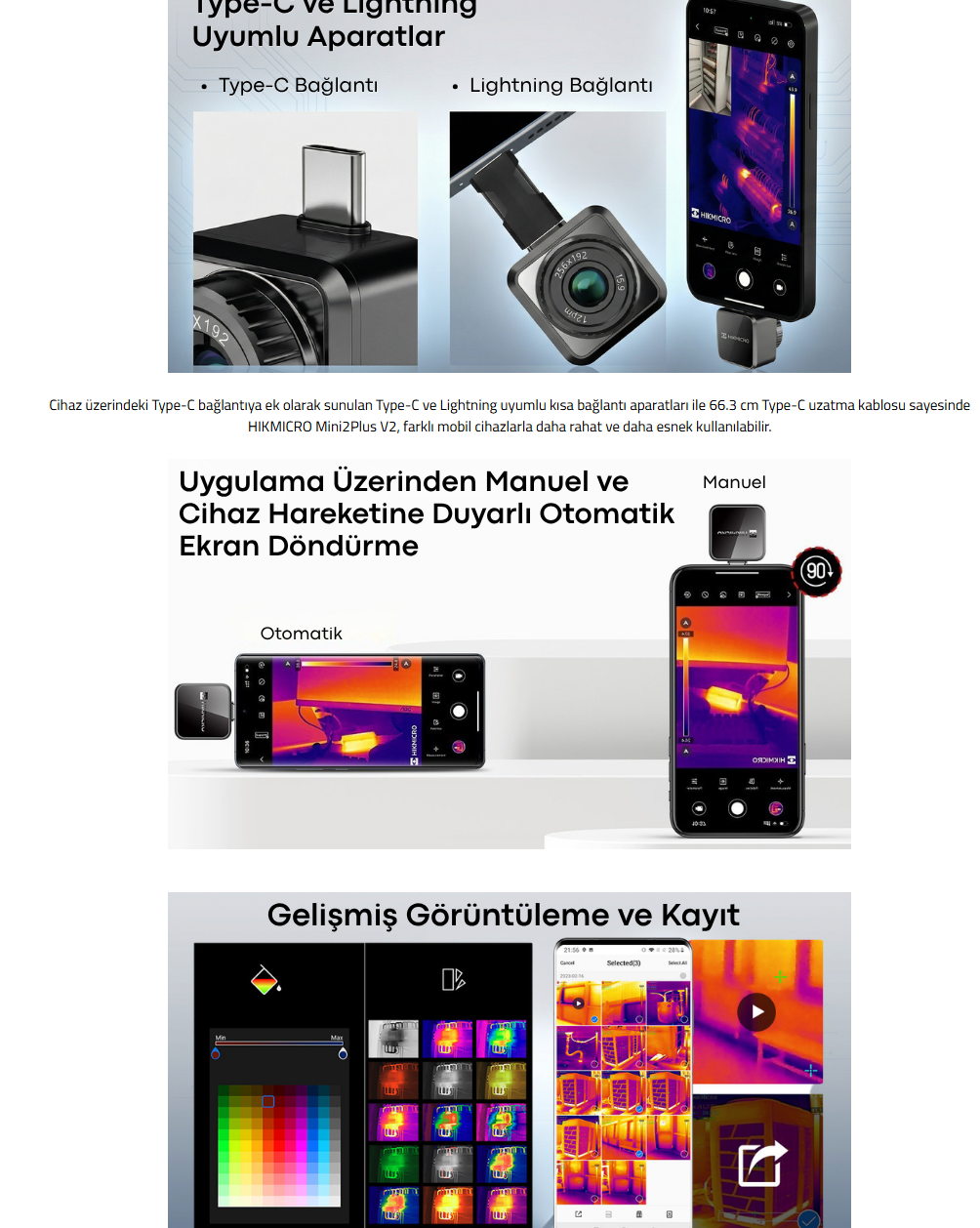 - HIKMICRO Mini2Plus V2; Type-C Android, Type-C iOS ve Lightning iOS bağlantı desteği sayesinde geniş cihaz uyumluluğu sunar. iPhone 15 serisi ve yeni nesil Type-C cihazlarla doğrudan, eski iPhone modellerle ise adaptör üzerinden kolay kullanım sağlar.