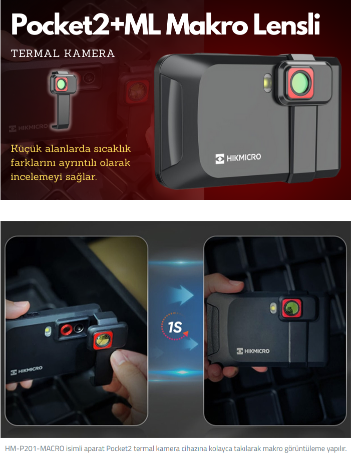 HIKMICRO Pocket2+ML makro lensli termal kamera; potansiyel tasarım kusurlarını tespit etmeye, küçük elektronik bileşenleri incelemeye, kısacası devre kartı gibi yerlerin küçük alanlarında sıcaklık farklarını ayrıntılı olarak incelemeyi sağlayan makro lens ile donatılmış bir termal kameradır. Bu işlem Pocket2 cihazına takılan makro lens ile sağlanır ve aparat Pocket2 serisi termal görüntüleme kameralarına kolayca takılır.