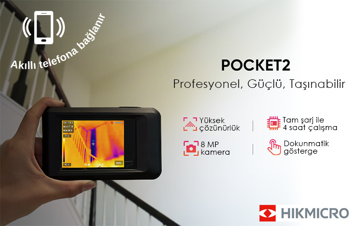 - HIKMICRO markasının Pocket2 termal kamera cihazı; tam bir teknik ekibi donatmak için ideal olan termal görüntüleme kamerasıdır. Küçük ve kullanışlıdır ancak aynı zamanda şantiyelerdeki zorlu çalışma koşulları için sağlam bir tasarıma sahiptir.