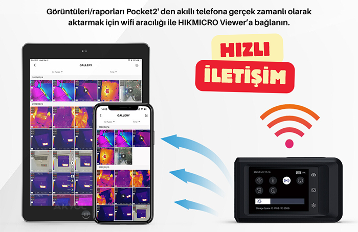 - Görüntüleme alanında kaydedilen görselleri Pocket2'den bir cep telefonuna aktarmak için HIKMICRO Viewer uygulamasını telefonuna indirmelisiniz. Ardından görüntüleri ve gerekli raporları hızlıca müşterilerinizle paylaşın.