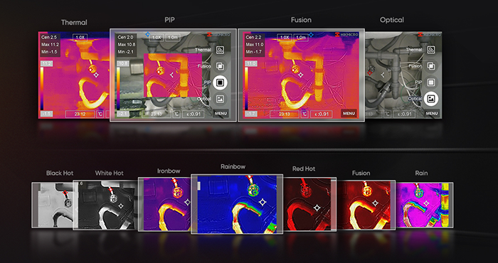 - Termal görüntüleri görüntülemek için siyah sıcak, beyaz sıcak, kırmızı sıcak, gökkuşağı, demir, füzyon ve yağmur olmak üzere yedi farklı renk paleti de mevcuttur.