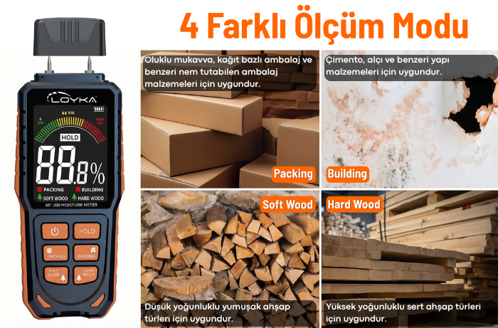 - Cihazın Ambalaj Malzemesi (Packing) modu; kraft kağıdı ve oluklu mukavva gibi emici ambalaj malzemelerinde nem kontrolü yapılmasına yardımcı olur. Bu özellik, ürünü yalnızca klasik ahşap nem ölçer sınıfının ötesine taşıyarak daha geniş kullanım senaryolarına uygun hale getirir.