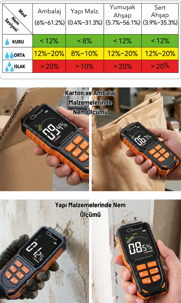 - Ölçüm aralıkları malzeme tipine göre değişmektedir: Ambalaj Malzemesi (Packing) %6–61.2, Yapı Malzemesi (Building) %0.4–31.3, Yumuşak Ahşap (Soft Wood) %5.7–56.1, Sert Ahşap (Hard Wood) %3.9–35.3. Bu yapı, farklı malzemelerde tek sabit aralık yerine daha uygun ölçüm yaklaşımı sunar.