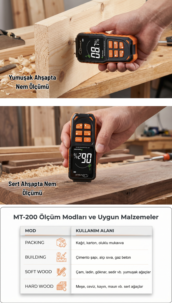 - MT-200, yalnızca ahşapta değil; çimento, sıva, alçı benzeri yüzeylerde kullanılabilecek Yapı Malzemesi (Building) modu da sunar. Bu sayede tadilat, yapı kontrolü, iç mekân nem takibi ve yüzey kuruluk kontrolü gibi uygulamalarda daha çok yönlü kullanım avantajı sağlar.