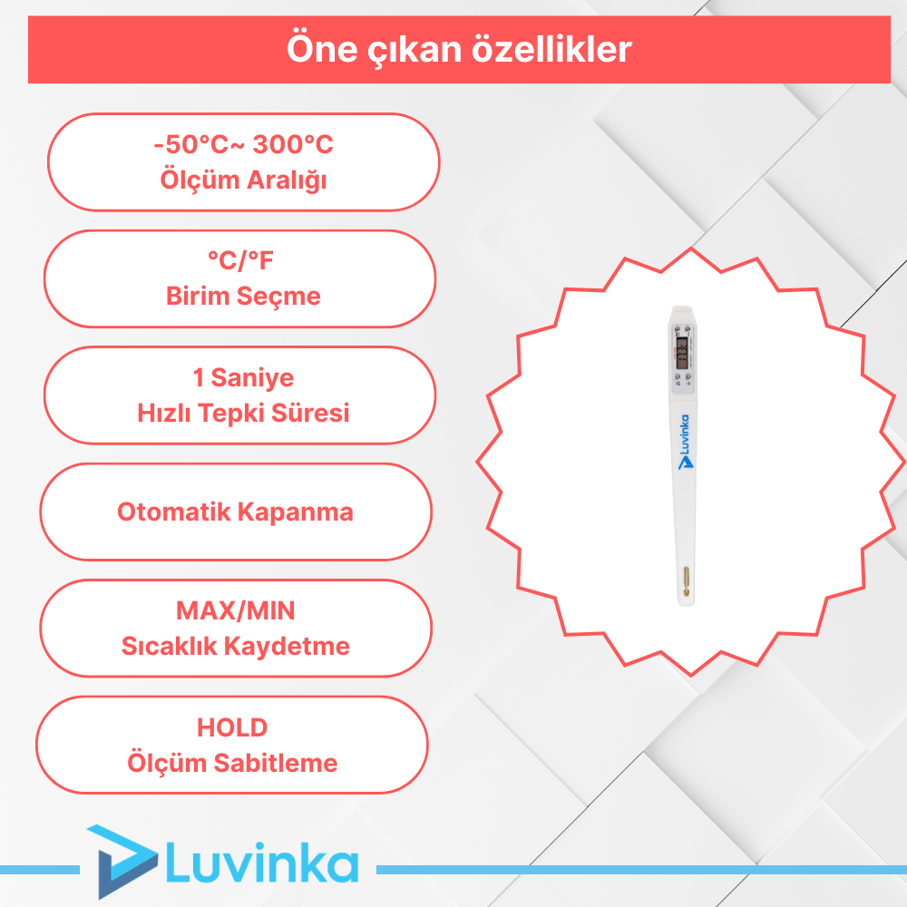Luvinka CH-103 Dijital Gıda Termometresi, −50 °C ile +300 °C arasında ölçüm yapabilen, ±1 °C hassasiyetli ve 1 saniyede tepki veren hızlı bir sıcaklık ölçüm cihazıdır. Saplama problu tasarımı sayesinde gıdaların, yağların ve sıvıların iç sıcaklığını anında gösterir. Mutfak, endüstriyel üretim ve gıda denetimi gibi uygulamalarda profesyonel ve güvenilir sonuçlar sağlar.