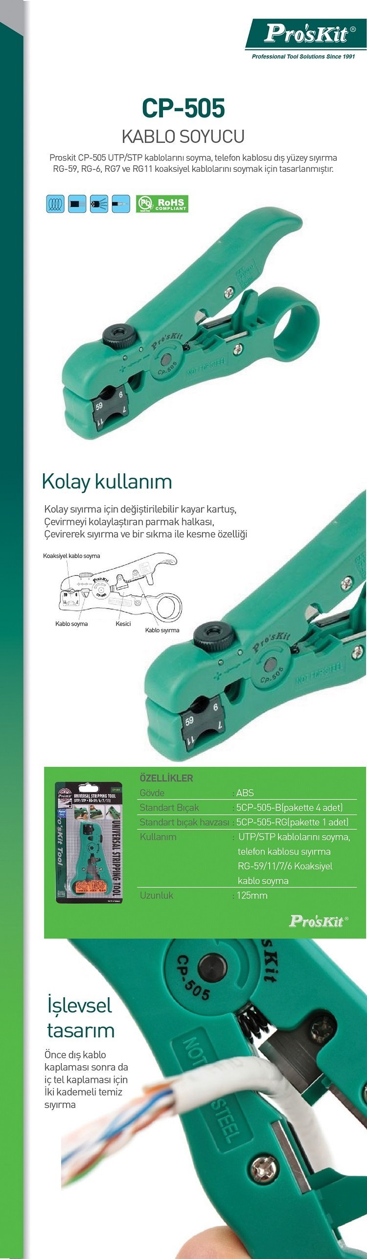 Proskit CP-505 Kablo Soyucu UTP/STP-RG 59/6/7/11: Koaksiyel ve Data Kabloları İçin Mükemmel Sıyırma Aracı