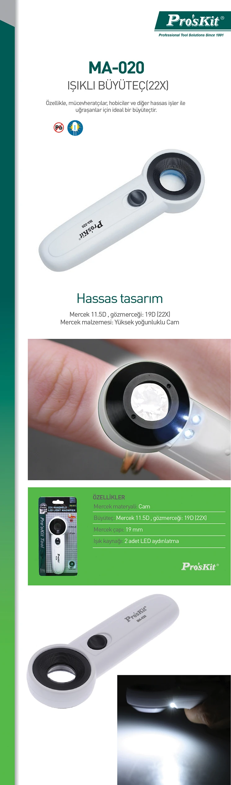 Proskit MA-020 Led Işıklı El Tipi Büyüteç, mücevheratçılar, hobiciler ve hassas işlerle uğraşan profesyoneller için tasarlanmış, yüksek büyütme oranına sahip etkili bir inceleme aracıdır. 22X büyütme oranı ve entegre LED ışık özelliği ile, en küçük detayları bile rahatlıkla görebilirsiniz. Yüksek yoğunluklu cam lensi ve dayanıklı yapısıyla, bu büyüteç her türlü ince işçilik için ideal bir seçimdir. Hem gece hem de düşük ışıklı ortamlarda mükemmel performans gösteren Proskit MA-020, uzun süreli kullanımlarda bile göz yorgunluğunu önler.