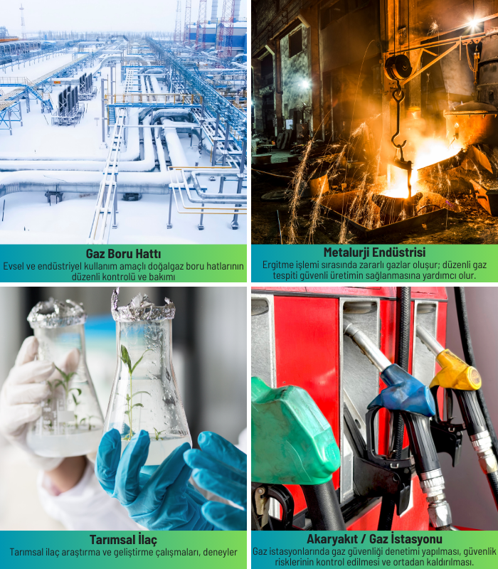 - Sndway SW-733GS gaz dedektörü; tarım ve hayvancılıktan kimya tesisleri ve madenciliğe, şantiyelerden yangın güvenliği, petrol-petrokimya ve atık su arıtma tesislerine kadar, toksik ve yanıcı gazlara karşı güvenlik testleri ile patlama riskinin izlenmesinin kritik olduğu birçok endüstriyel alanda güvenle kullanılabilir.