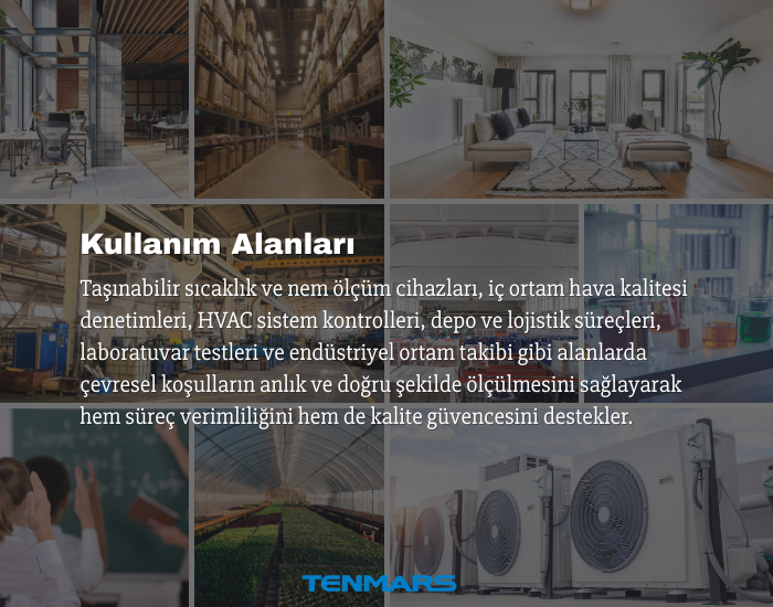 - Cihaz, -20 °C ile +60 °C arasındaki sıcaklık aralığını ve %0.1–99.9 RH nem aralığını hassas bir şekilde kaydederek, sıcak - soğuk depo ortam koşullarının kontrolüne kadar pek çok alanda kullanılabilir.