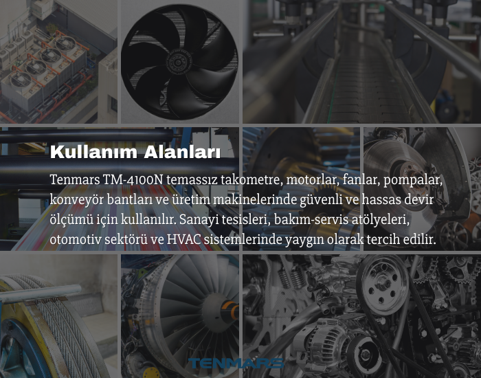 - Tenmars TM-4100N dijital takometre, temassız ölçüm özelliği sayesinde hareketli parçalara dokunmadan güvenli, hızlı ve hassas devir ölçümleri yapılmasını sağlar.